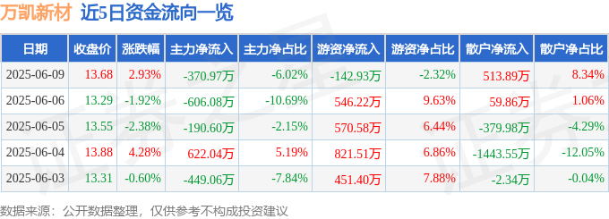 本站消息荆叶优配,截至2025年6月9日收盘,万凯新材(301216)报收于13.68元,上涨2.93%,换手率1.6%,成交量4.55万手,成交额6160.07万元。