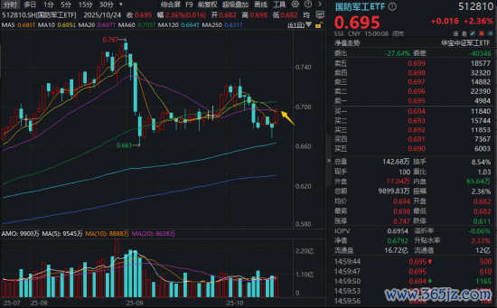 重磅会议公报首提“航天强国”,10月24日,商业航天概念大爆发,强势带动国防军工板块快速崛起!场内热门国防军工ETF(512810)盘中上探2.8%,场内收涨2.36%,一举收复5日及10日均线,释放拐点信号,全天成交逾9899万元。