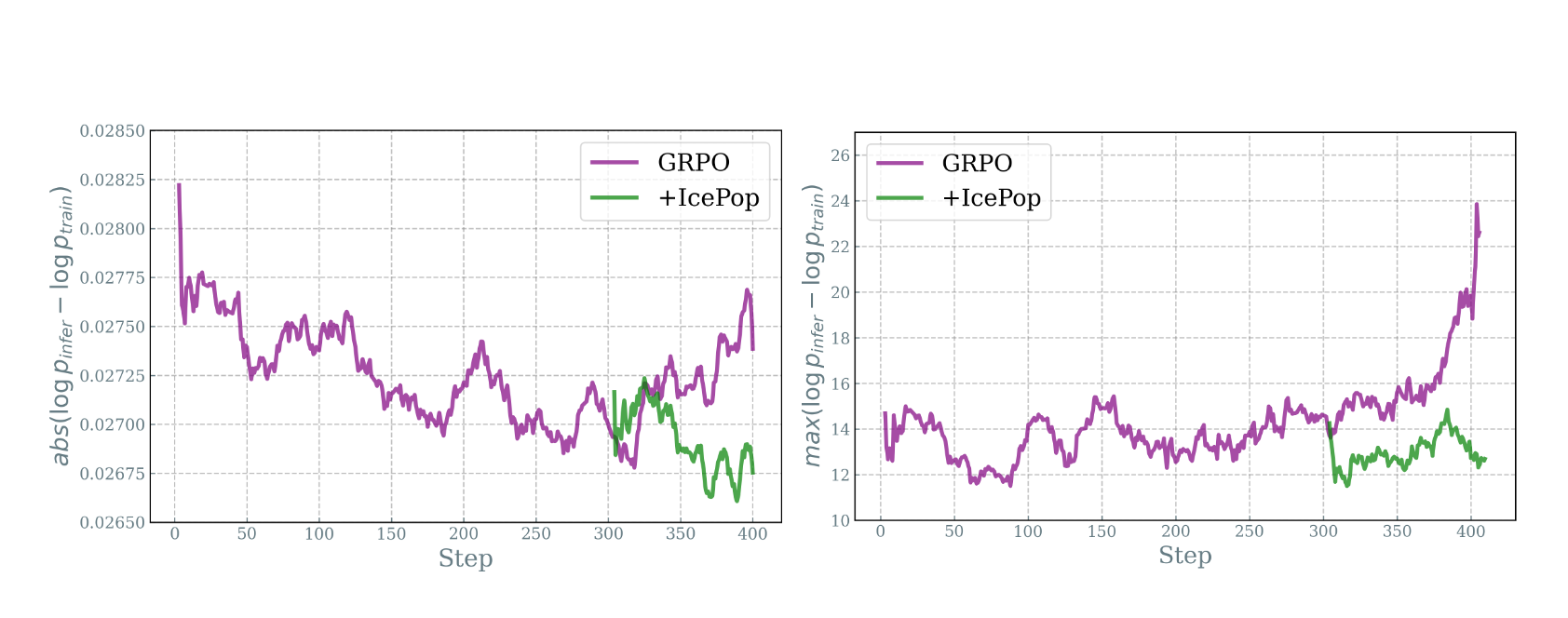 图左:GRPO训推差异随着训练成指数上升,icepop较为平稳;图右:训推差异最大值,GRPO随着训练上升非常明显,icepop维持在较低水位