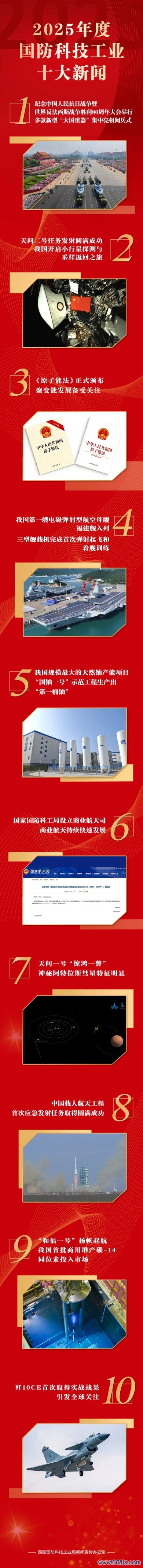 人民网北京1月12日电近日,国家国防科技工业局新闻宣传办公室正式对外发布2025年度国防科技工业十大新闻。